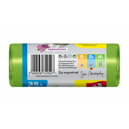 - Worki na śmieci o pojemności 35 l, zapachowe - 30 sztuk w opakowaniu. - Posiadają uszy do zawiązywania. - Wymiary: 49 x 60 cm + 17 cm - Pojemność worka na śmieci: 35L - Typ worka na śmieci: zapachowy