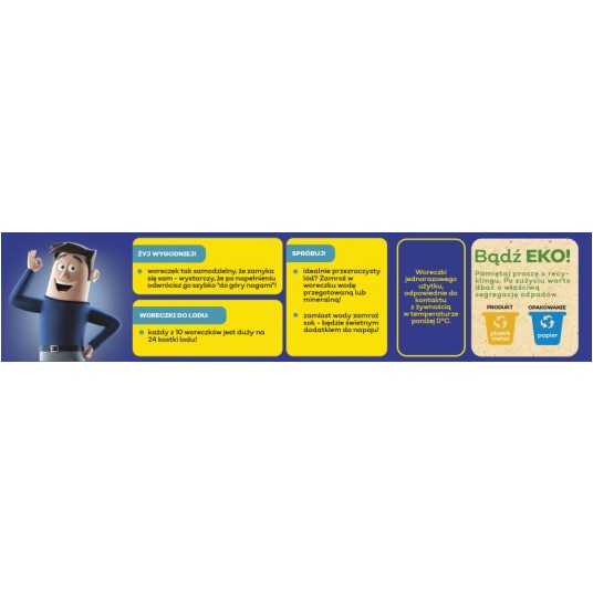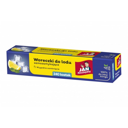 - Woreczki do lodu Jan Niezbędny są samozamykające (wystarczy je odwrócić "do góry nogami") - Produkt wykonany jest z grubej folii koloru niebieskiego, z białym nadrukiem - Woreczki są bardzo szczelne a przygotowanie kostek jest wyjątkowo łatwe - Aby lód był idealnie przejrzysty, do napełniania woreczków użyj wody przegotowanej lub mineralnej niegazowanej - Można w nich zamrażać nie tylko wodę, ale również soki owocowe, wino lub bulion do przygotowania zup - 240 kostek (10 listków po 24 kostki każdy) w kartonowym pudełku