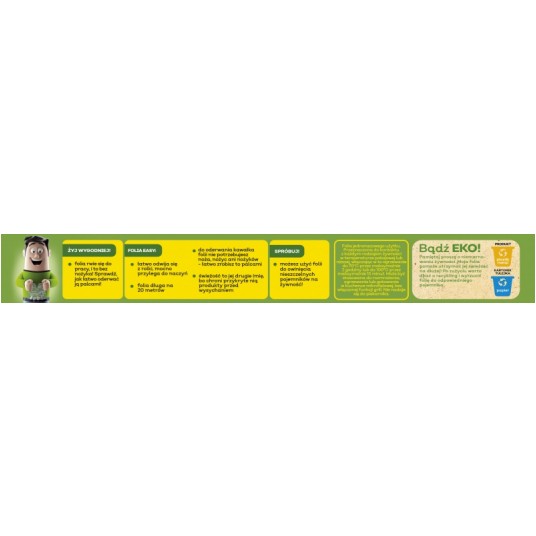 - Do równego oderwania dowolnej wielkości kawałka folii nie potrzebujesz nożyka czy ucinarki - łatwo rozerwiesz ją palcami - Zapewnia utrzymanie świeżości produktów spożywczych, chroni je przed wysychaniem - Łatwo się odwija z rolki, dobrze przylega do salaterek i innych naczyń - Folią do żywności możesz dodatkowo zabezpieczyć przed szkodnikami pojemniki, w których przechowujesz np. suszone grzyby i owoce - Nawój 20 m