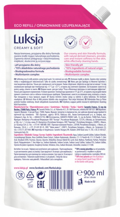 - Kremowe mydło w płynie Luksja Creamy & Soft Róża i Proteiny mleka zawiera środki myjące naturalnego pochodzenia - Skutecznie oczyszcza skórę, zapewniając jej pielęgnację i natychmiastową miękkość - Pozostawia na dłoniach subtelny zapach - Testowane dermatologicznie - pH przyjazne dla skóry - 93% składników naturalnego pochodzenia - Przebadany dermatologicznie - Zamknięty jest w wygodnym opakowaniu uzupełniającym zawierającym 68% mniej plastiku - Zachwyca zmysłowym zapachem róży przez długi czas - Rodzaj: zapas - Pojemność: 900 ml - Zapach: róża i proteiny mleka