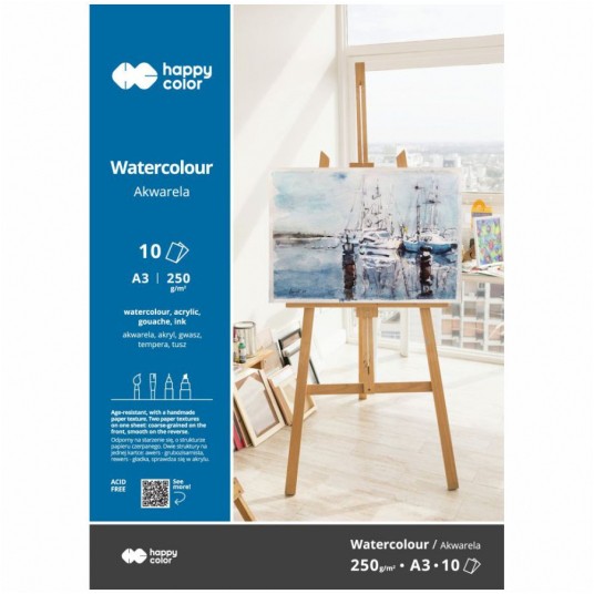 - Wysokiej jakości blok do malowania farbami akwarelowymi, temperami, gwaszem oraz farbami akrylowymi, a także do ołówka, pasteli, tuszu