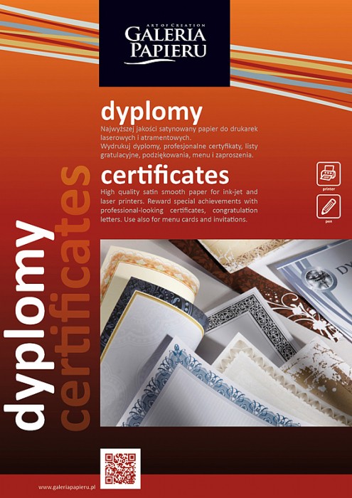 - Najwyższej jakości papier satynowany 170g/m2 - Przeznaczony do druku dyplomów z okazji rozpoczęcia lub zakończenia nauki, wyróżnień, konkursów - Polecany do drukarek laserowych i atramentowych - Do uzyskania profesjonalnego efektu wystarczy czarno-biała drukarka - Format: A4 - Opakowanie 25 arkuszy