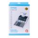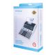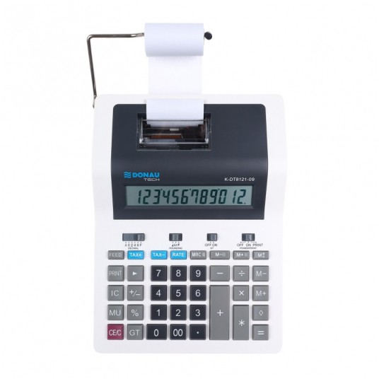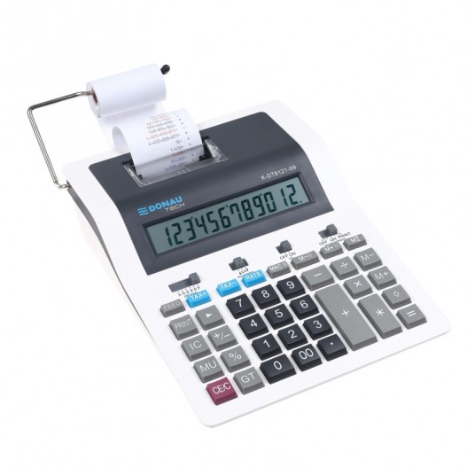Kalkulator drukujący Kolor: Biały; Wymiary: 267mm x 202mm x 77mm; Zasilanie: Bateria; Szerokość papieru: 58mm; Drukowanie w dwóch kolorach: niebiesko–czerwonym; Posiada 12cyfrowy wyświetlacz; Wyłącza się automatycznie.