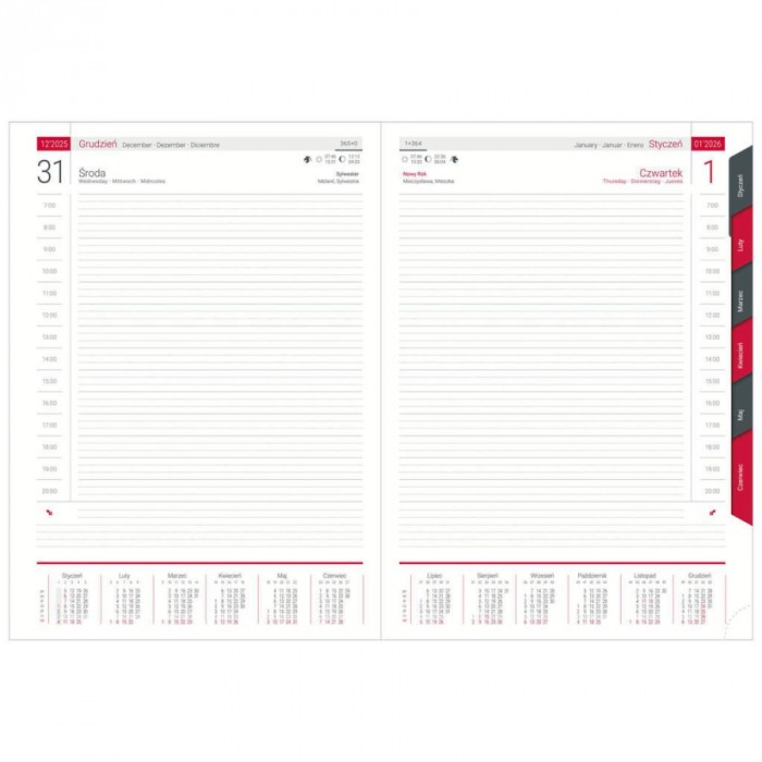 - Terminarz książkowy zawiera m.in.: plan roku, kalendarium 2025,2026 i 2027, plan każdego miesiąca, wschody i zachody Słońca, fazy Księżyca, plan urlopowy, wieczny kalendarz, wspólne oświadczenie o zdarzeniu drogowym, zasady pierwszej pomocy przedmedycznej, zasady selektywnej zbiórki odpadów, układ SI, alfabetyczny skorowidz teleadresowy, barwne mapy (PL, EU, świat, kalendarz pyleń, strefy czasowe)