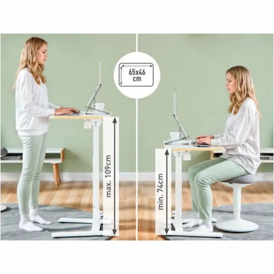 - Pomysłowo zaprojektowane ergonomiczne biurko pod laptopa do pracy w pozycji siedzącej i stojącej idealnie pasuje do małych przestrzeni - Umożliwia elastyczną i tymczasową pracę, a ponieważ można je złożyć do szerokości 16 cm, jest łatwe do przenoszenia i rozstawiania w dowolnym miejscu - Pneumatycznie wspomagana regulacja wysokości (74-109 cm) ułatwia zmianę pozycji między siedzącą i stojącą - Zapobiega dolegliwościom bólowym i stymuluje ruch mięśni, co służy poprawie samopoczucia - Blat o wymiarach 65 × 46 × 1,8 cm i maksymalnym obciążeniu 20 kg pomieści laptop z podstawką, klawiaturę i mysz komputerową. - Może być używany w pozycji pochylonej z dołączonym zdejmowanym zabezpieczeniem do laptopa - Blat i nóżki można całkowicie złożyć, co sprawia, że to małe biurko łatwo jest przechować (po złożeniu ma zaledwie 16 cm szerokości) - Biurko jest stabilne i nie przewraca się podczas przechowywania, a dodatkowo zajmuje niewiele miejsca - Rozłożysz je i złożysz w kilka chwil, a po zakończonej pracy bez trudu schowasz, dzięki czemu przestrzeń pozostanie czysta i uporządkowana - Waży 11 kg, więc po złożeniu można je z łatwością przenieść, korzystając z wygodnego uchwytu - Regulowane nóżki nie rysują podłogi i zapewniają stabilność biurka na nierównych powierzchniach - Przetestowane i zalecane przez niemiecki Instytut Zdrowia i Ergonomii IGR, zgodnie z normą DIN 26800 EN ISO 15537 - Posiada niemieckie certyfikaty bezpieczeństwa TÜV i GS, zgodne z normą PPP 51962A - Dostarczane w pełni złożone, z czytelną instrukcją użytkowania, w opakowaniu niezawierającym plastiku i nadającym się do recyklingu - Wymiary: 460 x 740 x 650 mm - Waga: 11 kg - Kolor: biały
