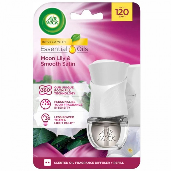 - Elektryczny odświeżacz powietrza Air Wick Moon Lily & Smooth Satin Electric wypełni Twój dom przyjemnym zapachem i stworzy w nim atmosferę harmonii - Produkt zawiera aż 2x więcej olejków eterycznych, oferując do 120 dni pięknego zapachu - Dzięki technologii dyfuzji 360°, regulacji intensywności zapachu i energooszczędnej pracy (3x mniejsze zużycie energii niż żarówka), jest to wygodne i stylowe rozwiązanie dla każdego wnętrza - Pojemność 19 ml - Zapach: księżycowa lilia otulona satyną - Zestaw zawiera wtyczkę oraz wkład zapachowy