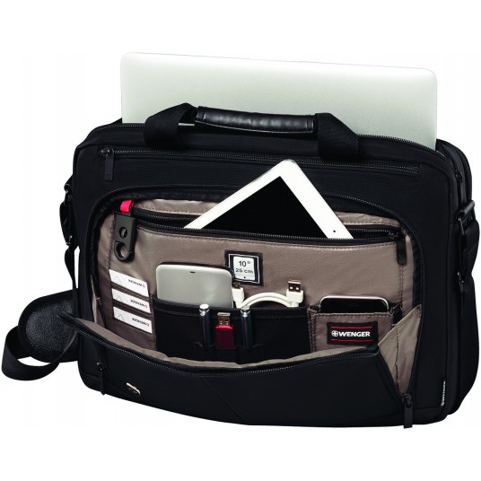 - Usztywniona przegroda na laptopa 16"/41cm oraz dedykowana kieszeń na tablet/czytnik 10"/25cm z wyściółką zapobiegającą zarysowaniom - Podwójne przegrody - Rozdzielacz na dokumenty - Organizator na niezbędne akcesoria - Kieszeń Quik Pocket zapewniająca łatwy dostęp do niezbędnych akcesoriów - Wyściełane uchwyty - Regulowany miękki pasek na ramię - Zamek błyskawiczny tylnej kieszeni można rozpiąć, aby powstał pasek Pass-Thru ułatwiający podróżowanie z bagażem na kółkach - Waga: 0,99 kg - Pojemność: 8L - Wymiary: 410x280x120mm - Materiał: nylon/PVC/poliester - Gwarancja: 3 lata - Kolor: czarny