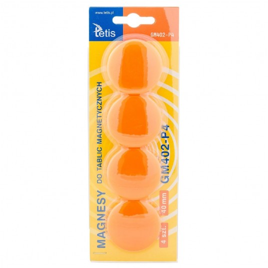 - Magnesy Tetis są niebywale mocne i trwałe, zapewniają prosty i praktyczny sposób przymocowania dokumentu lub notatki do powierzchni magnetycznych - Doskonałe do tablic i innych powierzchni magnetycznych - Pakowane na blistrze - Średnica: 40 mm - Kolor: pomarańczowy - Wzór: gładkie - Ilość: 4 sztuki