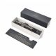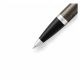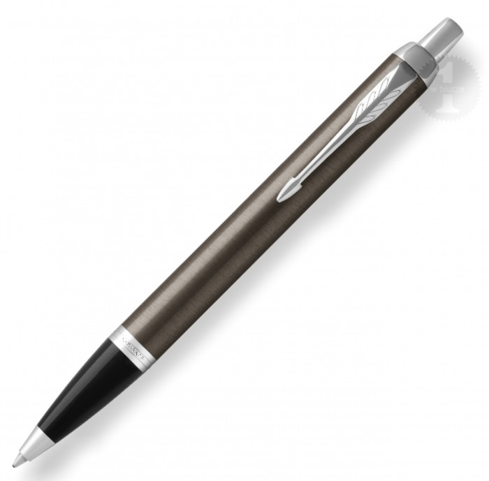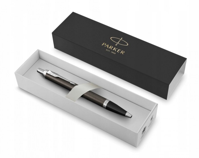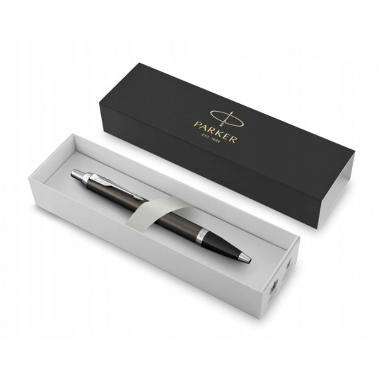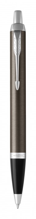 Na szlifowanej, mosiężnej bazie położono kilkanaście warstw satynowego lakieru w kolorze espresso. Pierścienie chromowane i polerowane. Część przednia wykonana z połyskującego, czarnego tworzywa sztucznego. Wyposażony w pstrykany system wysuwania wkładu. Idealny długopis Parker na prezent.