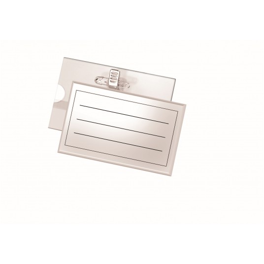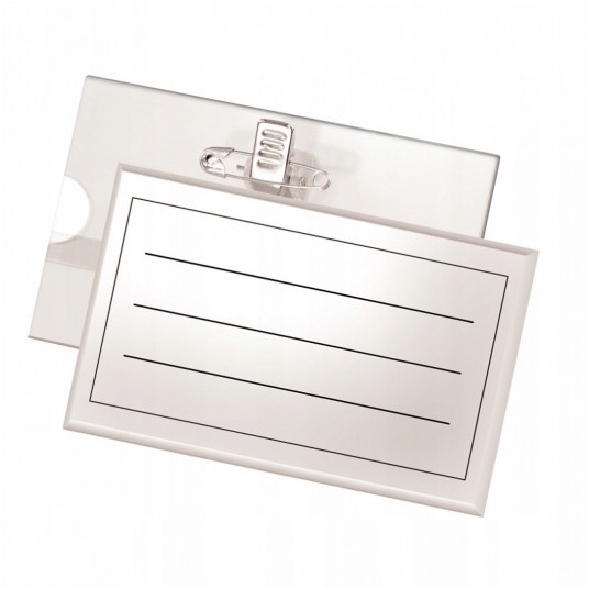 - Identyfikator z przezroczystego, sztywnego tworzywa, wyposażony w klips sprężynujący i niewielką agrafkę