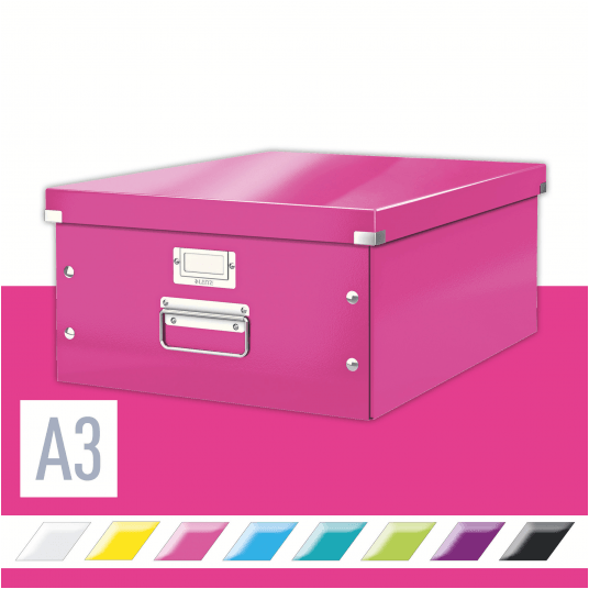 - Przykuwające wzrok, stylowe pudełko do przechowywania rysunków, albumów, plakatów i innych przedmiotów w formacie A3 i mniejszych - Szybkie i łatwe składanie/rozkładanie dzięki konstrukcji spinanej na napy (umożliwia redukcję powierzchni potrzebnej do przechowywania, kiedy pudełko nie jest używane) - Dodaj energetycznych i stylowych kolorów swojemu miejscu pracy w biurze lub w domu, wybierając produkty z naszej kolekcji WOW - Laminowana powierzchnia gwarantuje wspaniały wygląd, dłuższą żywotność produktu oraz łatwość usuwania zabrudzeń - Możliwość łatwego opisu zawartości dzięki wysokiej jakości metalowym ramkom na etykiety i białym etykietom - Wytrzymałe metalowe uchwyty do wygodnego przenoszenia pudła - Wykonane z wysokiej jakości wytrzymałego kartonu - Opatentowana konstrukcja zapewnia dodatkową ochronę przed przypadkowym otwarciem pudełka z cięższą zawartością