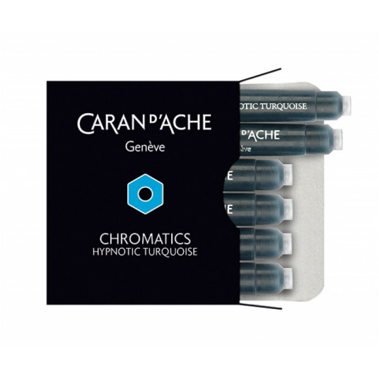 - Naboje atramentowe szwajcarskiej marki Caran d’Ache z kolekcji Chromatics - Charakteryzują się niezwykle intensywnym pigmentem, który nadaje im charakter i styl - Naboje umieszczone są w eleganckim, firmowym kartoniku - W zestawie znajduje się 6 nabojów - Kolor: turkusowy