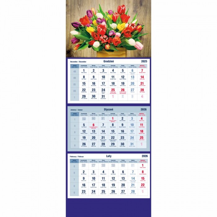 - Główka pełnokolorowa, okienko przesuwane, nazwy miesięcy i tygodni w wersjach językowych, miejsce na nadruk reklamowy