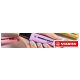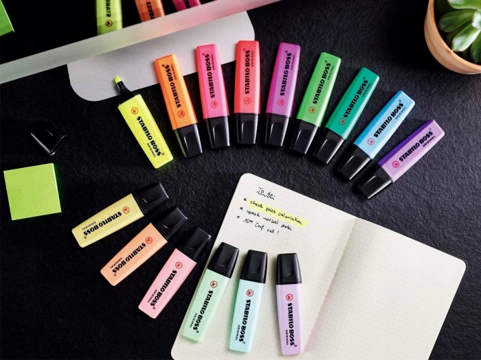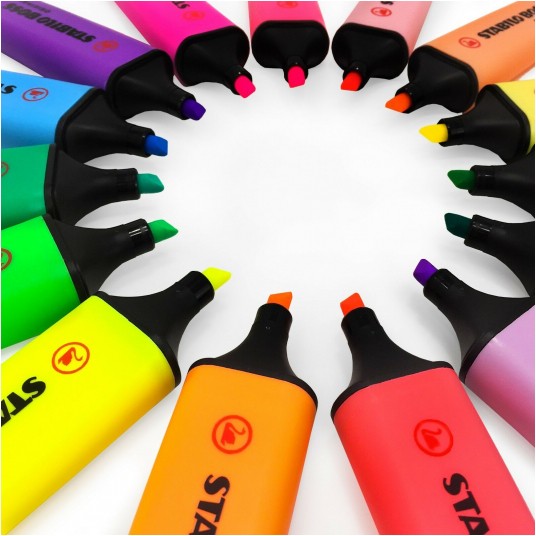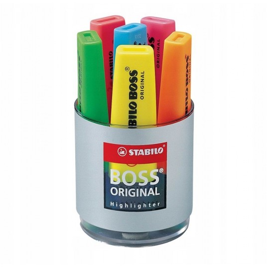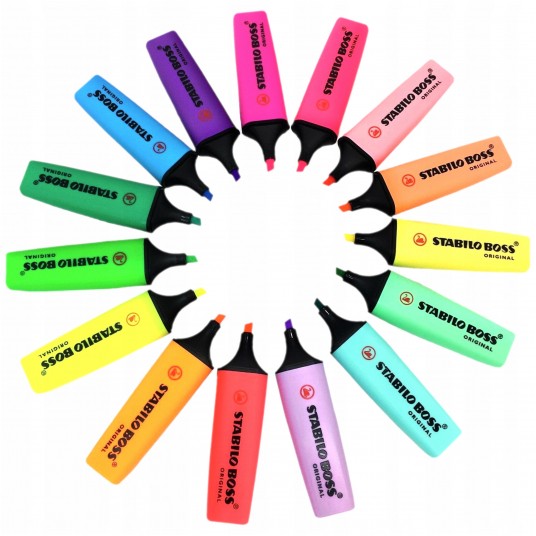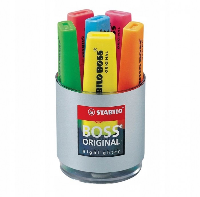 - STABILO BOSS ORIGINAL - prawdziwy klasyk wśród zakreślaczy i niedościgniony wzór! - Dostępny jest w 9 kolorach neonowych a także w 10 kolorach pastelowych - Razem aż 19 możliwości do wyboru - Grubość linii od 2 do 5 mm pozwala na zakreślanie tekstów o różnej wielkości - Nadaje się też do pisania, ozdabiania, hand letteringu - Technologia Anti-dry zabezpiecza tusz przed zasychaniem, dzięki czemu można go używać nawet przez 4 godziny i mieć pewność, że nie zaschnie - W trosce o środowisko wszystkie czarne elementy zakreślacza wykonane są z plastiku pochodzącego z recyklingu - Opakowanie to plastikowy piórnik na biurko w kształcie kubka, zawierający 6 szt. zakreślaczy