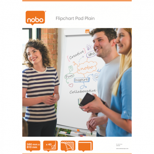 - Papier perforowany dla łatwego odrywania - Arkusze papieru o wymiarach 580 x 810 mm - Zwykły papier - 40 arkuszy - Papier TMP o gramaturze 60 g / m2 - Łatwe w użyciu ze sztalugami Nobo Flipchart