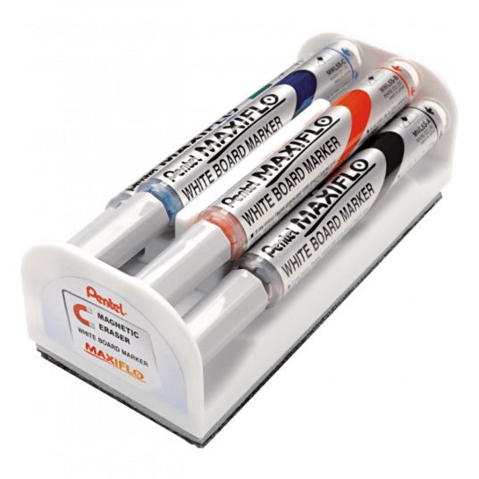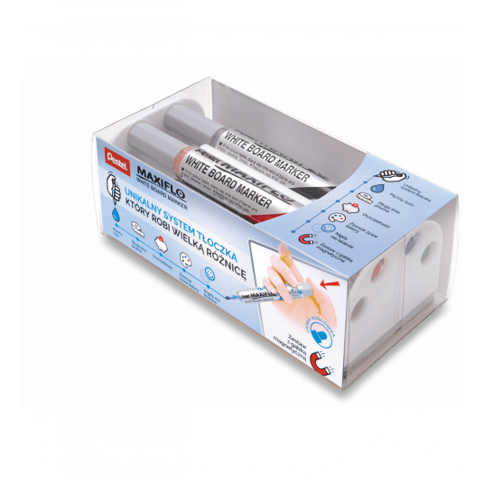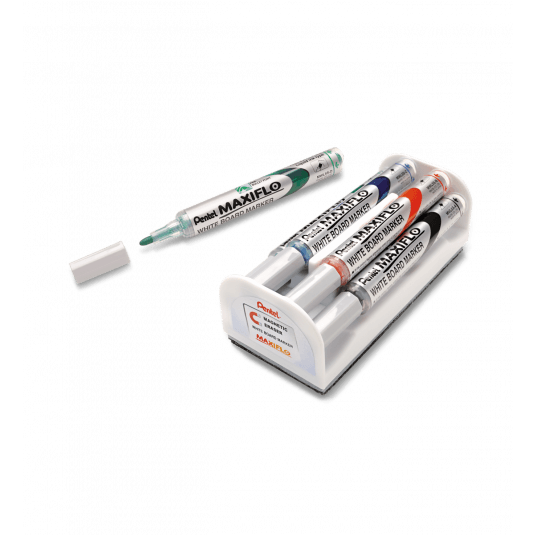 - Marker MAXIFLO do białych i ceramicznych tablic. - Płynny tusz dozowany w razie konieczności nawilżenia końcówki za pomocą tłoczka (zamiast tradycyjnego sączka). - Marker pisze wyrazistą linią aż do ostatniej kropli tuszu. - Kilkakrotnie dłuższa linii pisania niż w standardowych markerach z sączkiem - 1200 m. - Nie zawiera substancji trujących ksylenu ani toluenu. - Nadaje się na papier, plastik, karton, tablice suchościeralne. - Zestaw MWL5S-4N zawiera 4 markery (czarny, czerwony, niebieski, zielony) oraz gąbkę magnetyczną.