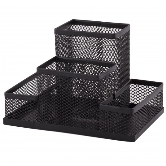 - Metalowy przybornik na biurko służący do organizacji miejsca pracy.