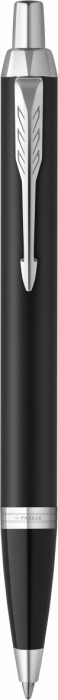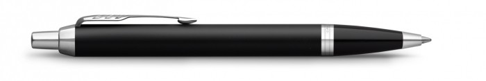 Korpus długopisu Parker IM Matowy Czarny CT wykonano z mosiądzu pokrytego błyszczącym, czarnym lakierem. W serii IM po transformacji wyraźnie zmienił się uchwyt, który obecnie wykonany jest z połyskującego, czarnego materiału polimerowego. Całość wieńczą wykończenia platerowane chromem.