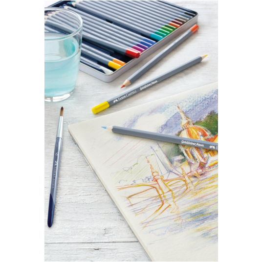 - Przy użyciu mokrego pędzla szkic lub motyw zaprojektowany przy użyciu kredek Goldfaber Aqua można zamienić w wspaniałą akwarelę.