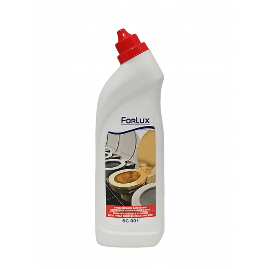 - Preparat Forlux SG 01 w postaci żelu do codziennego mycia muszli klozetowych, umywalek i armatury łazienkowej - Skutecznie usuwa kamień i rdzę - Konsystencja żelu ułatwia przyleganie preparatu nawet do pionowych powierzchni, co wydłuża czas działania i gwarantuje większą skuteczność mycia - Posiada bardzo przyjemny, świeży zapach. - Żel jest dostępny w opakowaniu 0,75 litra typu "kaczka" co pozwala na równomierne i oszczędne nanoszenie, jednocześnie ułatwiając dotarcie preparatu do trudno dostępnych miejsc. - Sposób użycia: Mycie muszli klozetowych, bidetów itp.: Preparat nanieść bezpośrednio na mytą powierzchnię, odczekać ok.10min i spłukać wodą. Mycie umywalek i armatury: Preparat nanieść na gąbkę lub ściereczkę, którymi przecieramy mytą powierzchnię, następnie spłukać i wytrzeć do sucha - Skład: < 5% niejonowy związek powierzchniowo czynny, 5 - 15% kwasy nieorganiczne, kompozycja zapachowa, CI 16255, CI 110825. - pH 1