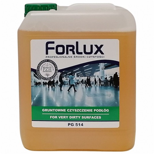 - Preparat Forlux PG 514 przeznaczony jest do gruntownego mycia powierzchni maszyna szorującą, odpornych na środki zasadowe. - Doskonale sprawdza się również przy myciu ręcznym za pomocą mopa. - Skutecznie usuwa z powierzchni zestarzały brud, smary, oleje oraz gumowe ślady po wózkach i butach w marketach oraz zakładach przemysłowych. - Preparat Forlux PG 514 bardzo dobrze nadaje się do usuwania wszelkich zniszczonych powłok ochronnych. - Może być stosowany także do utrzymania czystości w placówkach służby zdrowia oraz zakładach przemysłu spożywczego i gastronomii. - Atest HŻ/01260/02/2012. - Sposób użycia: W zależności od stopnia zabrudzenia stosować rozcieńczenie od 300 ml do 1000 ml preparatu na 10 litrów wody. Nanieść roztwór na czyszczona podłogę i pozostawić na około 10 minut, następnie szorować i zebrać rozpuszczony brud. Przy myciu codziennym maszyną szorującą stosować rozcieńczenie 100 ml na 10 litrów wody. Do usuwania starych powłok ochronnych zalecamy dozowanie od 500 ml do 1000 ml na 10 litrów wody. - Skład: < 5% wodorotlenek potasowy, < 5 % niejonowe związki powierzchniowo czynne, < 5% EDTA, kompozycja zapachowa. - pH 14