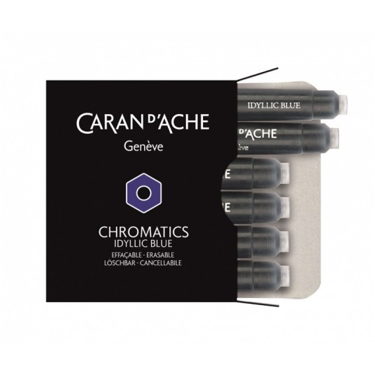 - Naboje atramentowe szwajcarskiej marki Caran d’Ache z kolekcji Chromatics, kolor Idyllic Blue. - Charakteryzują się niezwykle intensywnym pigmentem, który nadaje im charakter i styl. - Naboje umieszczone są w eleganckim, firmowym kartoniku. - W zestawie znajduje się 6 nabojów.