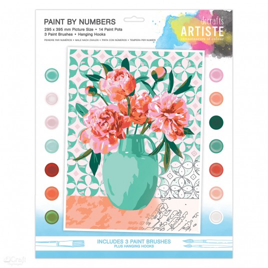 - Zestaw zawiera: tekturowe podobrazie 395 x 295 x 2 mm, 14 pojemników z farbą akrylową i 3 pędzelki