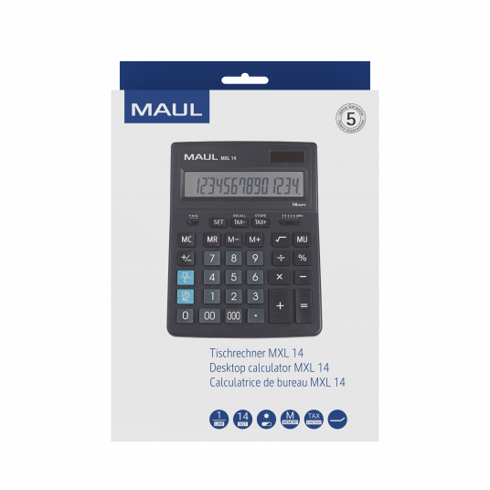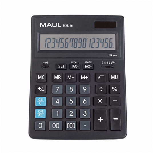 Solidny, wytrzymały kalkulator biznesowy MAUL MXL 16 w kolorze czarnym z dużym, 16-pozycyjnym wyświetlaczem LCD. Niezawodny, dokładny i o profesjonalnym wyglądzie. Szybsze wyszukiwanie: przyciski funkcyjne i numeryczne w różnych kolorach. Ergonomiczny: wyświetlacz umieszczony pod kątem dla ułatwionego odczytu. Duży rozmiar i wyraźniejszy wyświetlacz pozwalają na większy komfort pracy. Przyciski z tworzywa sztucznego: wytrzymałe i łatwe do czyszczenia. Z antypoślizgowymi, gumowymi punktami na odwrocie. Energooszczędny, dzięki podwójnemu zasilaniu baterią i baterią słoneczna, z funkcją automatycznego wyłączania. Wyposażony w 3 przyciski pamięci, obliczanie pierwiastków kwadratowych, procentów, podatków, przycisk z podwójnym zerem, zmiana znaku. Dodatkowo możliwość automatycznego zaokrąglania w górę lub w dół oraz wyświetlanie cyfr po przecinku. Gwarancja: 5 lat. Wymiary: 20,5 x 15,5 x 3,5 cm. Zawiera jedną baterię (LR44). Ekologiczne opakowanie z tektury, bez użycia plastiku, z eurozawieszką.